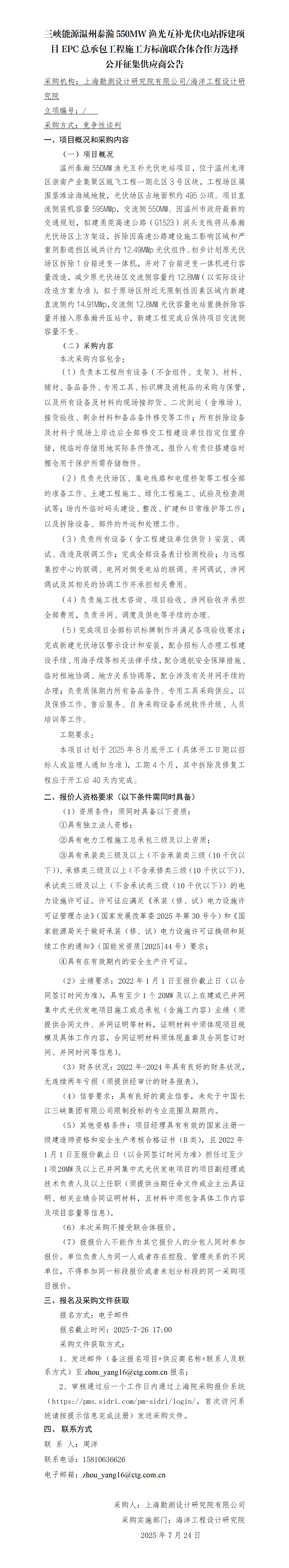 三峽能源溫州泰瀚550MW漁光互補光伏電站拆建項目EPC總承包工程施工方標前聯合體合作方選擇公開征集供應商公告